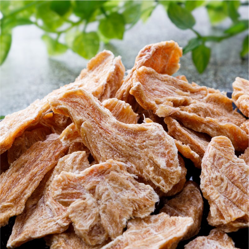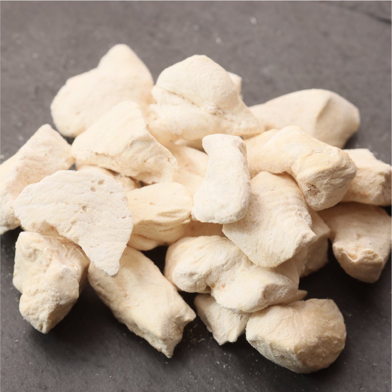 新鮮な鶏むね肉をフリーズドライ加工した、素材のおいしさをそのまま味わえる一品です。旨みを逃さないようスチームで丁寧に下処理し、さくふわ食感に仕上げました。おやつとして与えるのはもちろん、手でも砕きやすいため、つぶしてごはんに振りかけたり、ぬるま湯につけて水分を戻してから与えるなど、色々なアレンジも可能です。