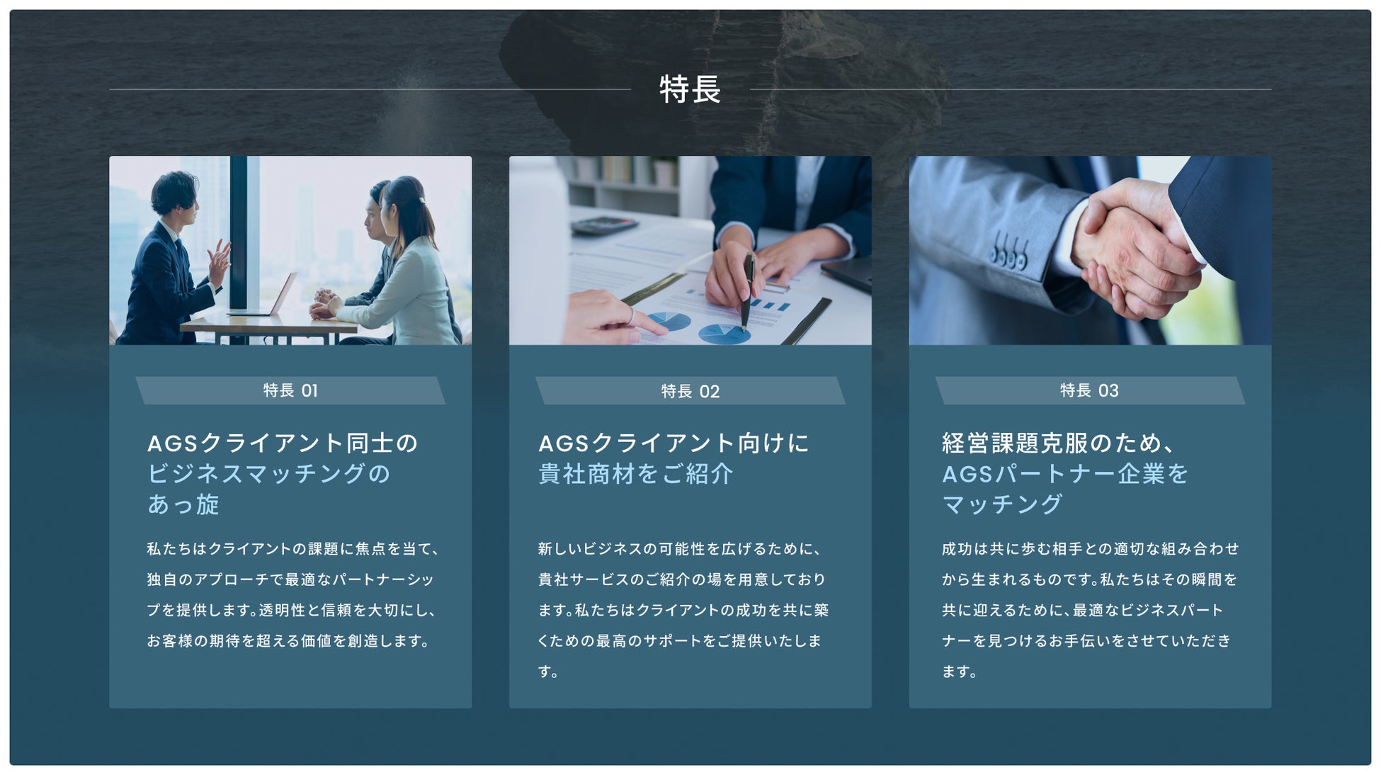AGSグループ(本社:東京都千代田区、代表者:虷澤篤志、廣渡嘉秀)は、2024年4月17日、AGSクライアントの商材・サービスをご紹介するサイトを開設しました。本サイトでは、クライアント及びパートナー企業の皆様の商材・サービスやマッチング事例等をご覧いただけます。AGSのクライアントの皆様の多様な商材・サービスを知っていただき、新たなビジネスチャンスを創出する機会をご提供いたします。