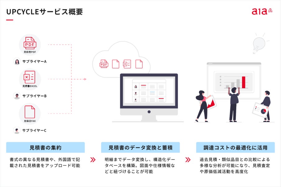 UPCYCLEは上図の通りユーザーが見積書をシステム上にアップロードするだけで、見積書に記載された見積明細情報が活用できるようデータ化・加工され、UPCYCLE上での比較・分析によってデータに基づくコストダウン余地の発掘が可能になります。