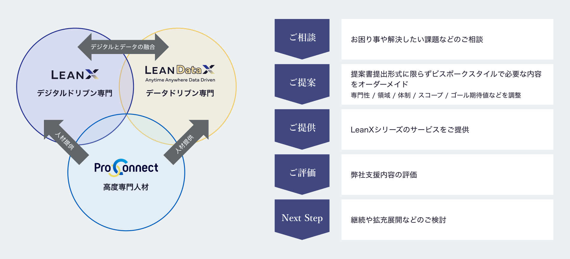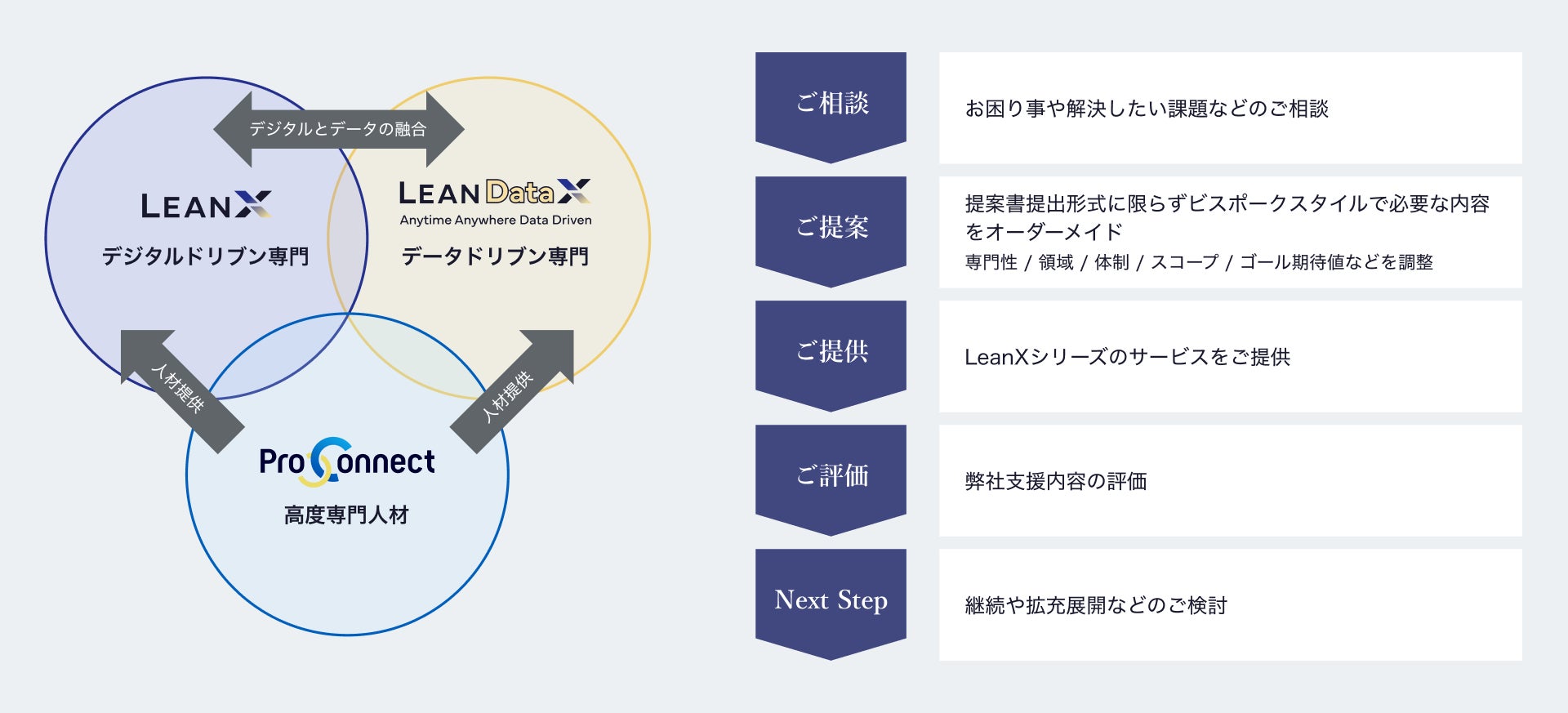 お客さまのご要望に応じて、デジタルドリブンであるLeanXおよび高度専門人材を提供するProConnectを組み合わせての提供もさせていただくことで、 ビスポークスタイルのオーダーメイドサービスを提供しております。