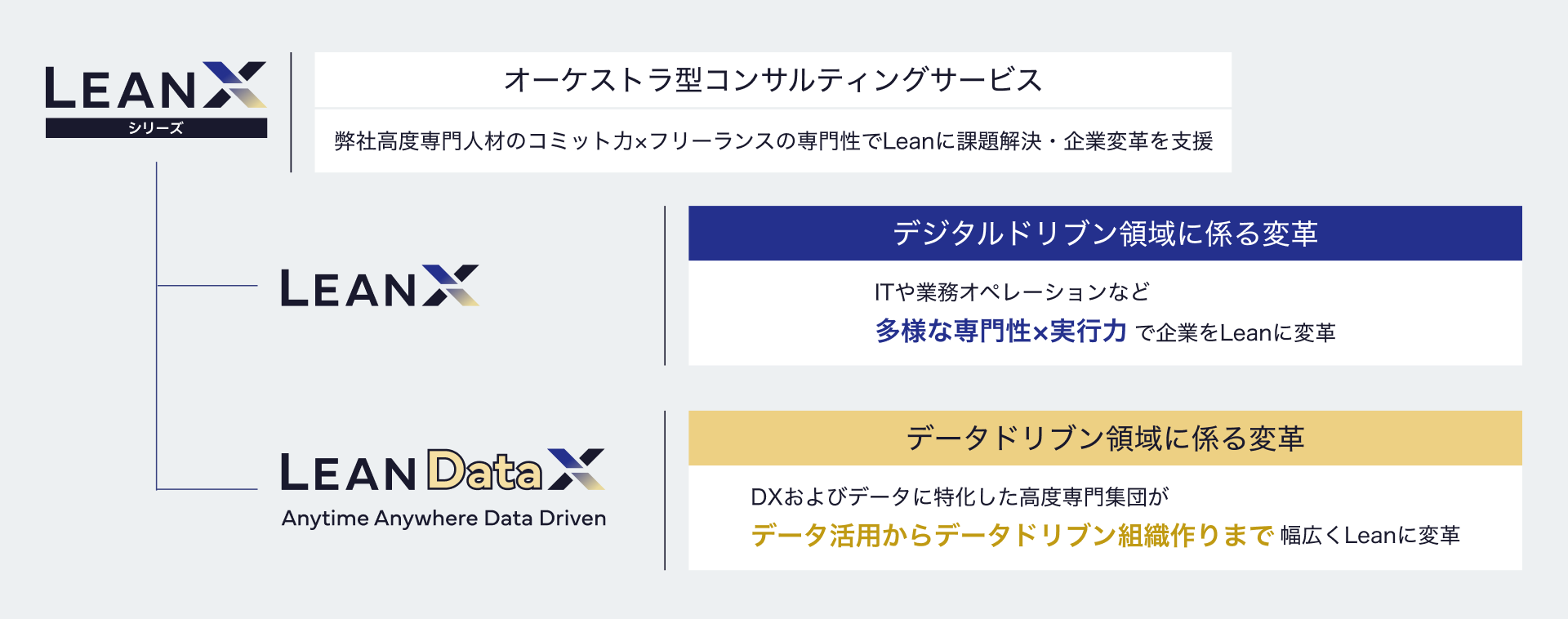 この度は、LeanXシリーズの中でも、データドリブンに特化したLeanDataXのサービスを正式にリリースいたしました。 LeanDataXにおけるサービスは、後述のとおり、データ活用戦略策定、ガバナンス、組織変革、データ活用人材育成、分析支援、アセスメント、DMO支援と、 いわゆるデータ活用に係るサービスから成り立っております。また、業務経験も有するデータドリブンの専門家を有しております。