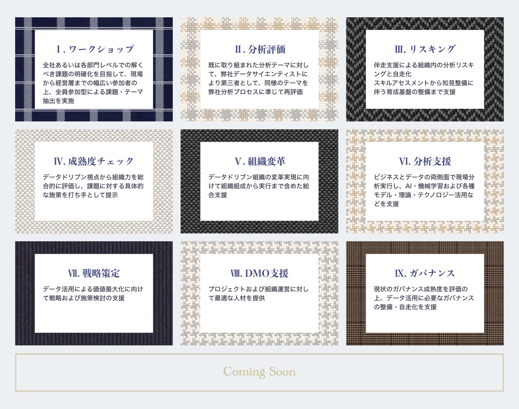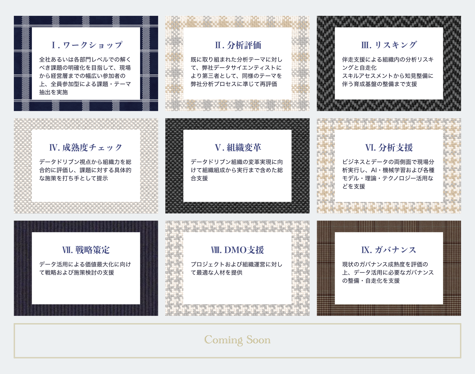 データドリブン・デジタルドリブンに特化しつつも、企業の経営目線で必要となる戦略をはじめとした策定から、変革および内製化までの総合的な支援を展開。