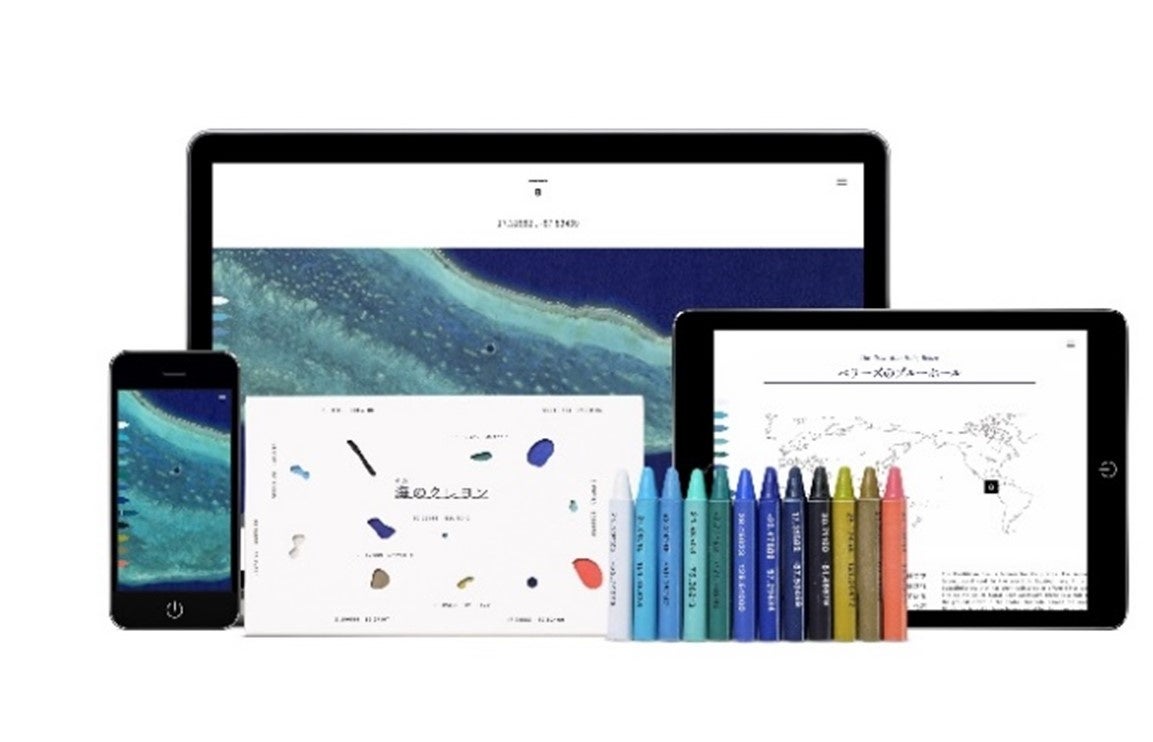 「海のクレヨン」は、宇宙事業社であるスカパーJSATが、宇宙から撮影された衛星画像をもとに世界12カ所の海から色を抽出し、クレヨン職人とともに細部まで忠実に12色を再現しました。それぞれの色に名前を付けず、海の場所を示す緯度経度が記されています。公式ホームページと連動し、色からつながる地球の神秘や、世界の国々の海がこのような色になった理由、地球温暖化をはじめとする環境問題を学ぶことができる仕掛けになっています。