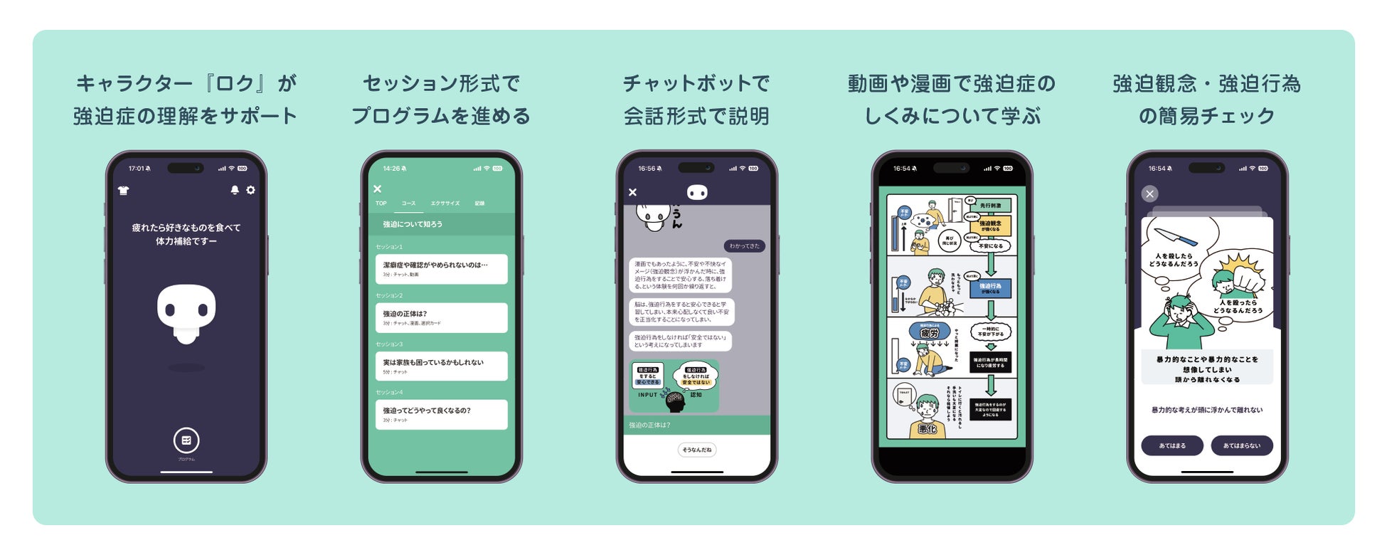 強迫症、社交不安症など精神疾患について知ってもらうための疾患啓発を目的とした、子供から大人までどなたでも無料でお使いいただけるアプリです。アプリではチャットボットでキャラクターが説明を行い、動画、漫画などを用いて疾患の特性やどうやってその疾患にかかってしまうのか知ることができます。また、音声ガイダンスなどで不安な気持ちとどう付き合っていくと良いのかといったレッスンも搭載しており、まずは自身で疾患について知り、対処法を練習してみるということが行えます。