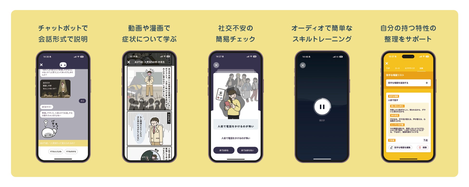 「人前が苦手ですごく緊張する」「人と話すのが苦手で友達とうまくすごせない」、そういった悩みを抱えているけれど、どうしたらよいのかわからず、一人で悩んでいる人や医療機関に相談するのはハードルが高いと感じている人や家族も多いと思います。そういった人にまず使っていただきたいアプリです。少しでも自分のつらさを乗り越える助けになれば嬉しいです。