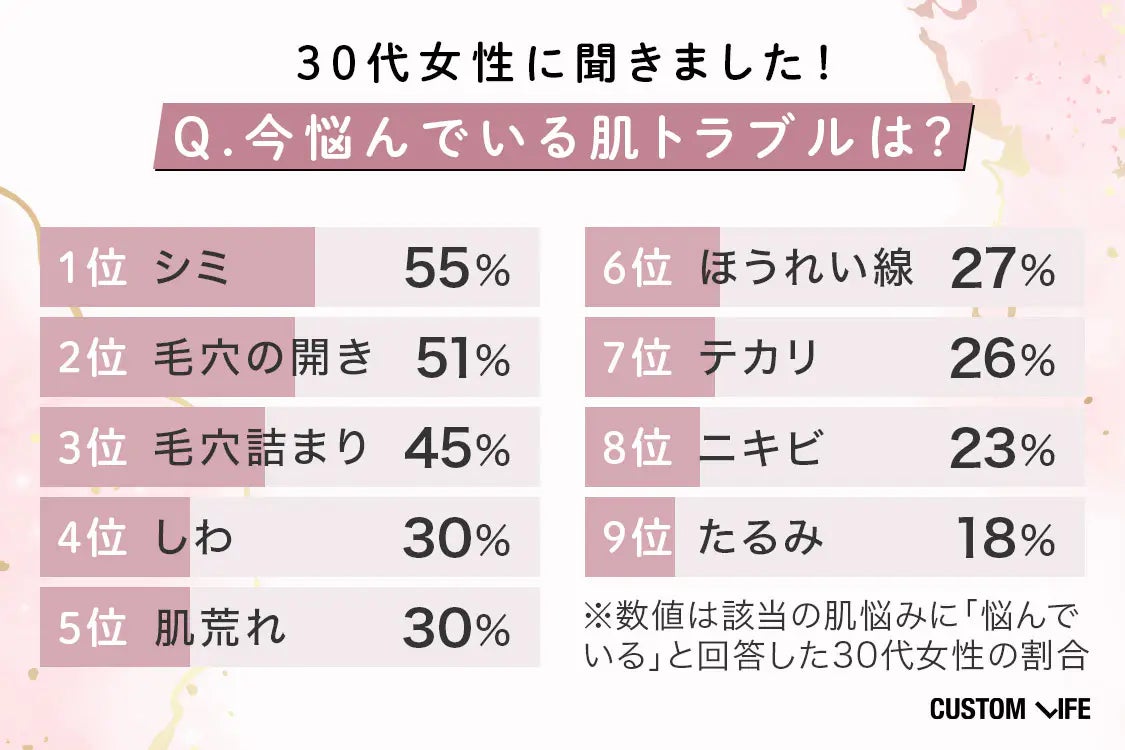 はじめに30代の女性200人を対象にしたアンケートで「今悩んでいる肌トラブルは?(複数回答可)」と質問したところ、「シミ(55%)」と回答した方が最も多く、次いで「毛穴の開き(51%)」「毛穴詰まり(45%)」と続きました。