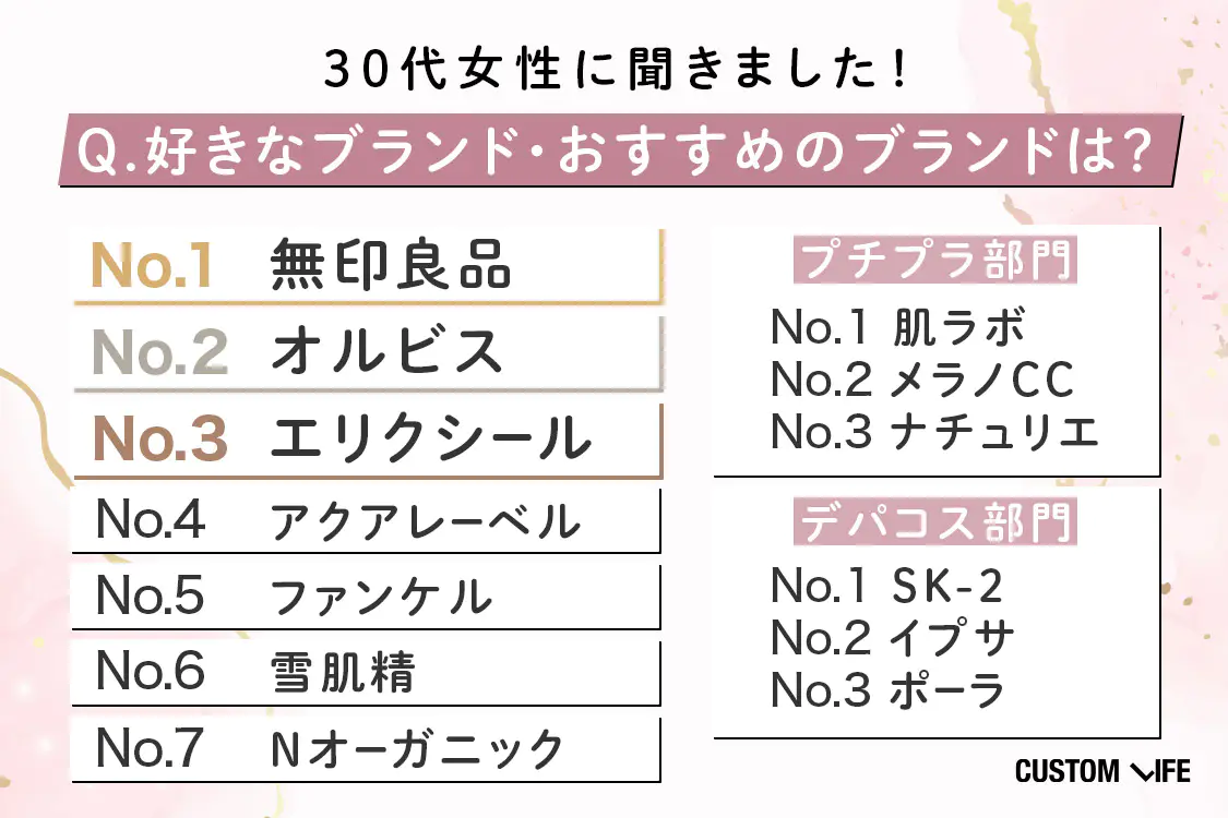 さらに「好きなブランド・おすすめのブランド」について質問したところ、次のようなブランドが30代の女性に支持を集めている傾向にあることがわかりました。