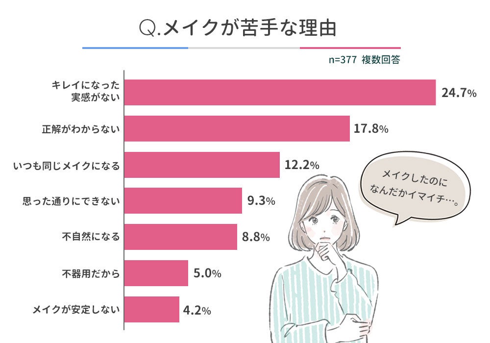 2位「正解がわからない(17.8%)」、3位「いつも同じメイクになる(12.2%)」と続きます。