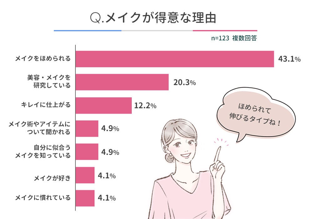 「メイクが得意」と答えた123名に「得意だと思う理由」を聞いたところ、1位は「メイクをほめられる(43.1%)」でした。