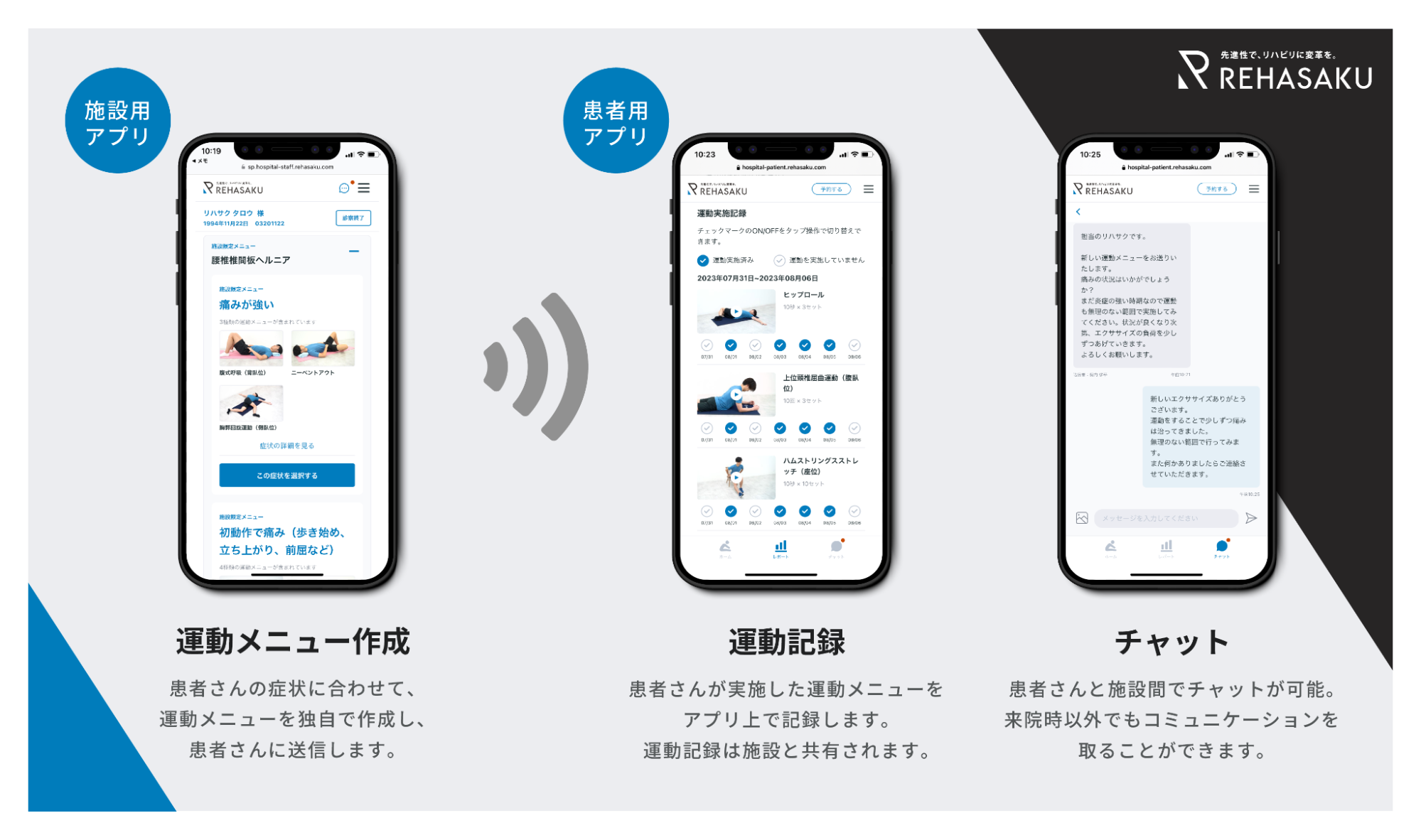 リハサクは医療機関で働くセラピストのリハビリ業務と、患者の自宅での運動をサポートする「運動療法クラウドシステム」です。
