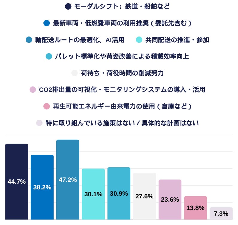 次いで「エネルギー効率の高い輸送モードへの転換(モーダルシフト)」(44.7%)、「最新車両・低燃費車両の利用推奨」(38.2%)が続き、大規模な投資や転換と並んで、日々のオペレーション改善への関心が極めて高いことが判明。