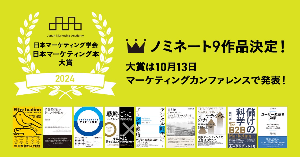 日本マーケティング学会(会長:西川 英彦)は、第7回「日本マーケティング本 大賞2024」のノミネート9作品を決定いたしました。