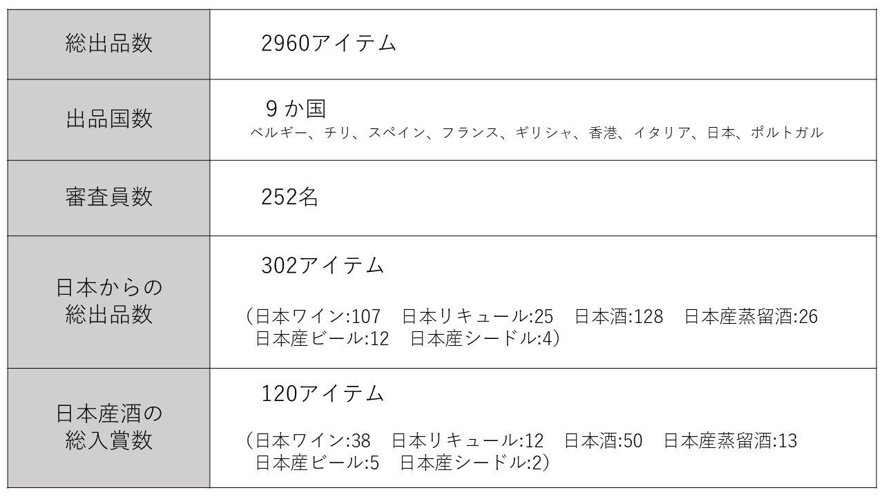 2020年:世界から4470アイテムの出品。日本からは176アイテム出品。うち日本ワインが50アイテム(赤21アイテム、白25アイテム、スパークリング4アイテム)、日本リキュールが30アイテムの出品。同年から増設された「日本酒部門」には、96アイテムの出品(うち純米大吟酒31、純米吟醸酒23、純米酒23、熟成酒7、スパークリン酒12)。