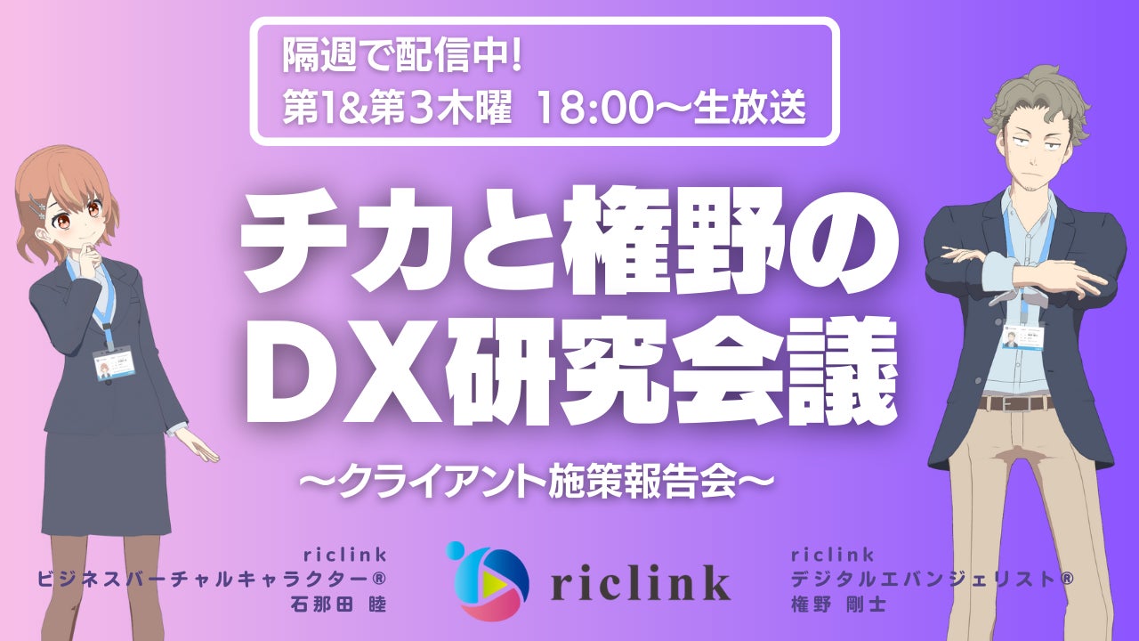riclinkのオフィシャルビジネスバーチャルキャラクター®︎である石那田睦と権野剛士が、クライアント様での事例や課題などを元にディスカッションする中でDXを研究し、その研究内容と結果、課題解決のヒントを報告していく会です。