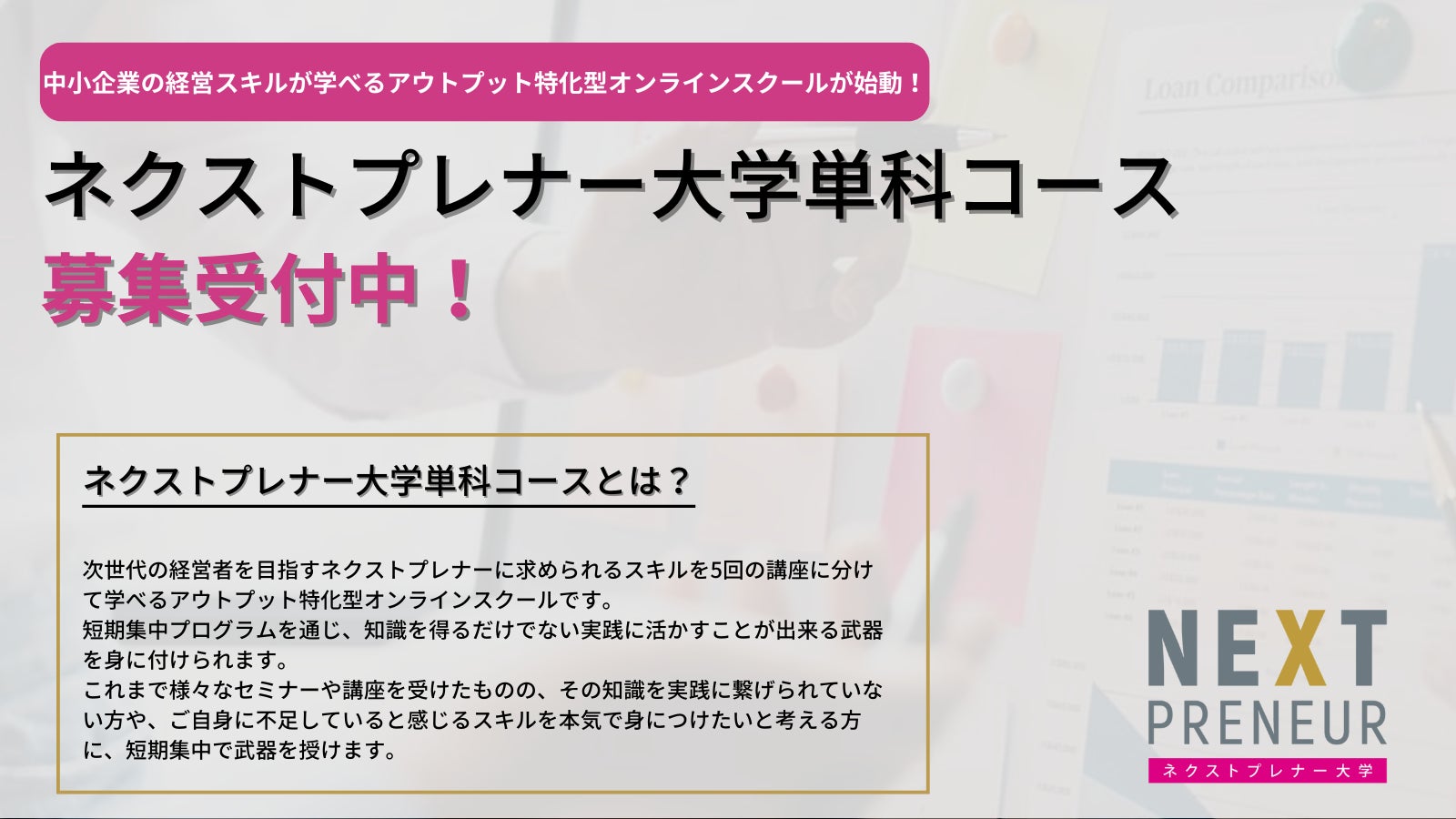 中小企業の経営スキルが学べるアウトプット特化型オンラインスクール「ネクストプレナー大学単科コース」2023年1月14日開講。第1弾はアイデア“ゼロ”でも“1か月”で事業を創る「新規事業開発」