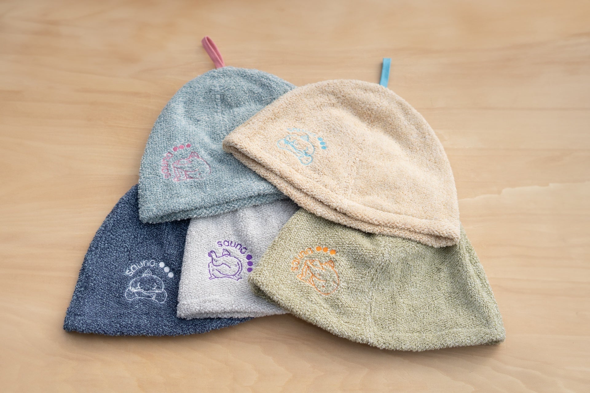 SAUNA OOO のキャラクター刺繍入りで、髪と頭皮を熱から守る必携アイテム。