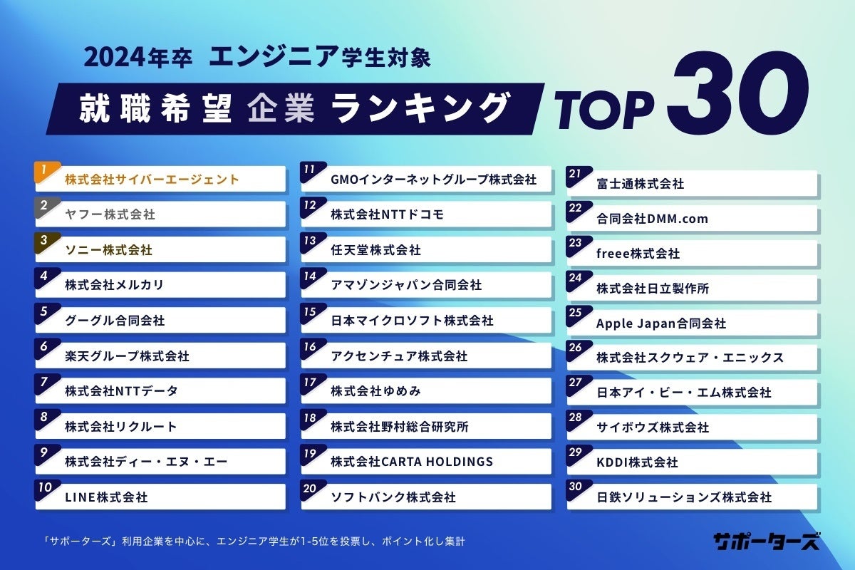 - 「2024年卒 エンジニア学生対象 就職希望企業ランキング」総合TOP30