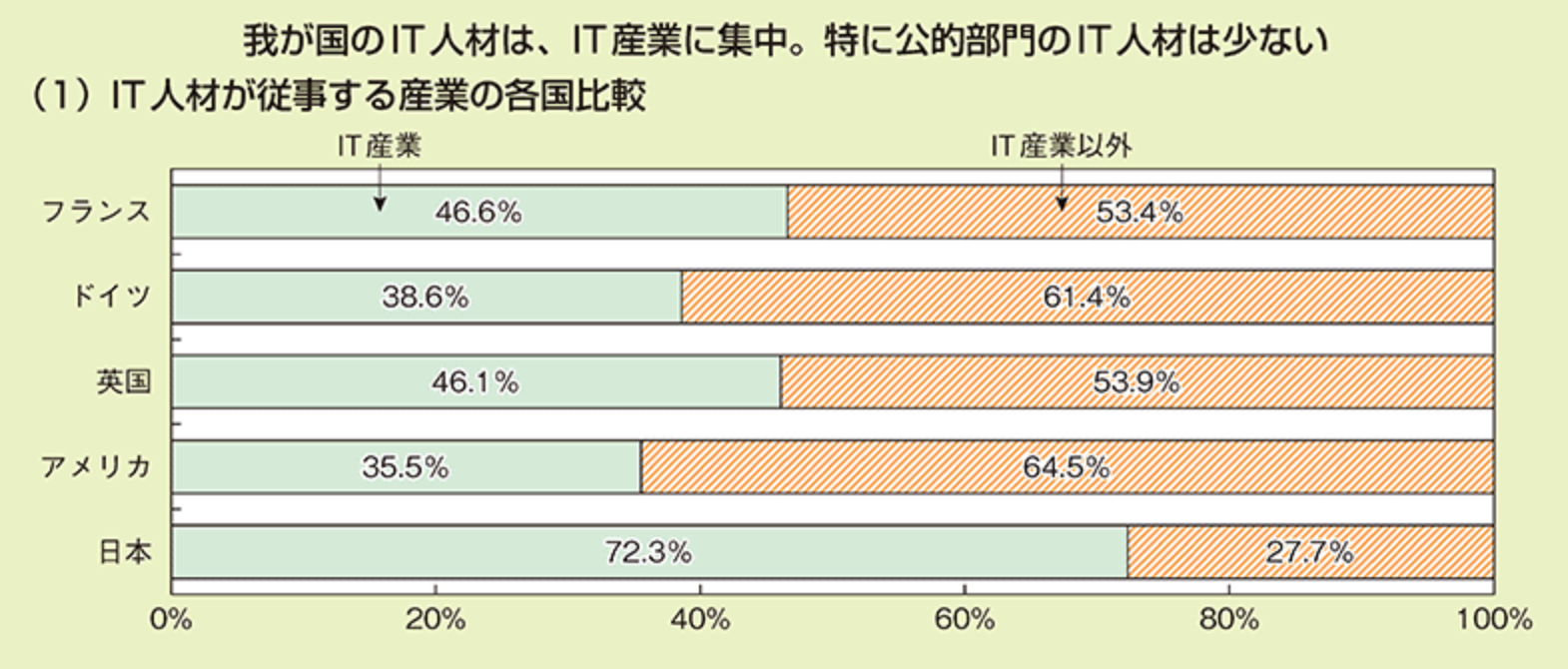一方、日本国内ではIT人材の7割以上がIT産業に就職をしており、これは他国と比較して突出して高い割合となっています。しかしIT産業「以外」にIT人材が就職しづらいことは、DX(デジタルトランスフォーメーション)推進の観点で大きな課題にもなっています。