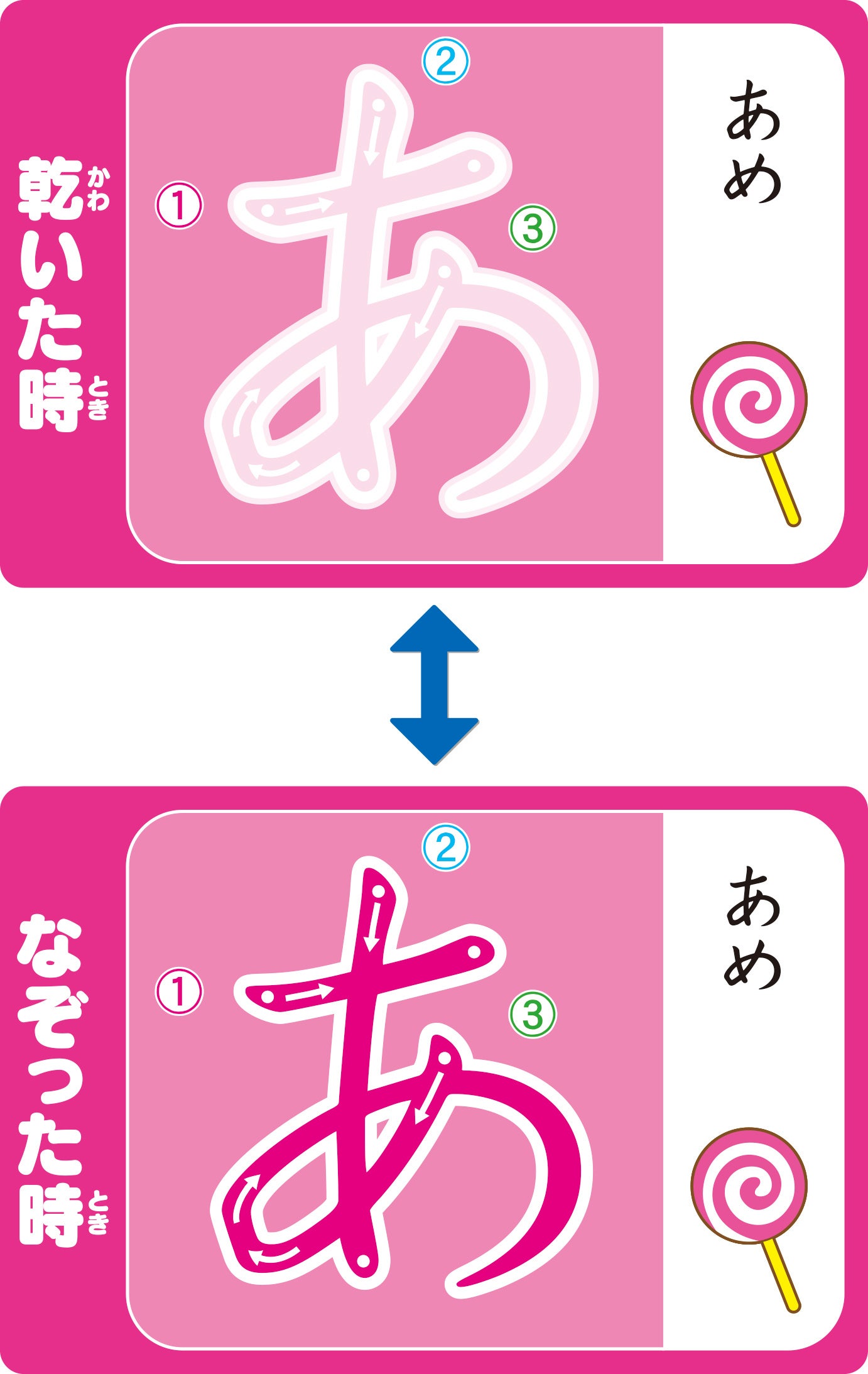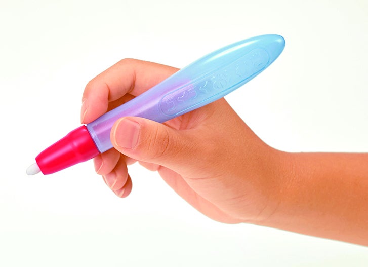 専用のペンに水道水を入れて準備完了。ひらがな・カタカナ・すうじ・ABCのれんしゅうボードをなぞってお勉強ができます。水で書くので、服や手を汚すことがなく、乾かせば何回でも練習できます。専用の細書きペンは、名古屋市立大学の横山清子教授と共同研究で作り上げた形状のペン。人間工学に基づいた形状で、後端の膨らみが手にフィットし、正しいとされる持ち方に誘導しやすくなっています。