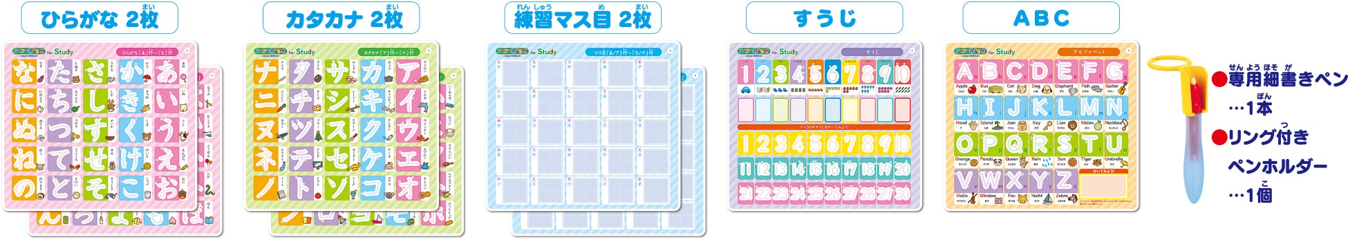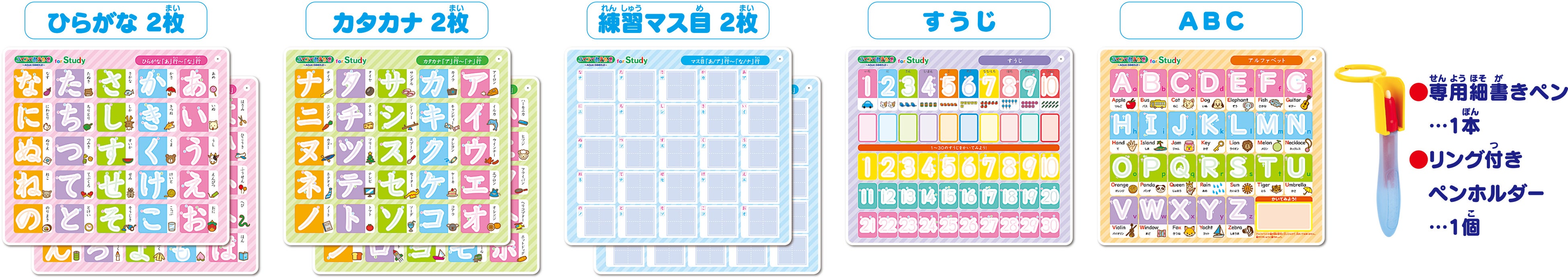 セット内容 :ひらがな(2枚)、カタカナ(2枚)、練習マス目(2枚)、すうじ(1枚)、ABC(1枚)、