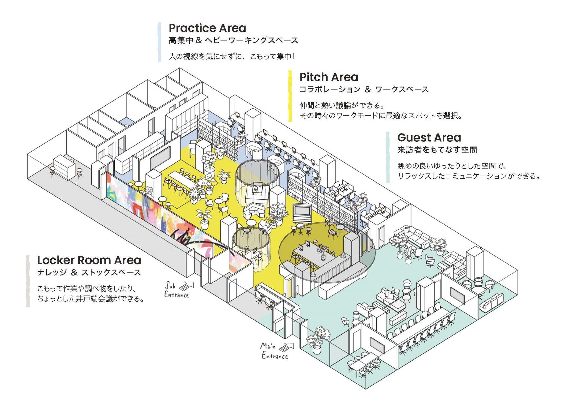 “人と人を繋げるのは人”という原点に立ち返り、ソフト・運営面も含めた新たな挑戦、実験的なワークプレイスです。オフィスは、執務エリアをピッチエリア、プラクティスエリア、ロッカールームエリアの3つに分け、さらにオフィスの約1/3をオープンなゲストエリアとし、社内外をつなげるプラットフォームとして活用します。また、ユーザーが空間を通じてホスピタリティとクリエイティビティを感じるための仕掛けとして、オフィス内にアートやスタイリングを施しています。オフィス中央には社員の子供たちとアーティスト井上純氏との共創によって生み出された 壁画が大きな存在感を示し、ここで働く人が日常的に創造性を感じる事ができます。