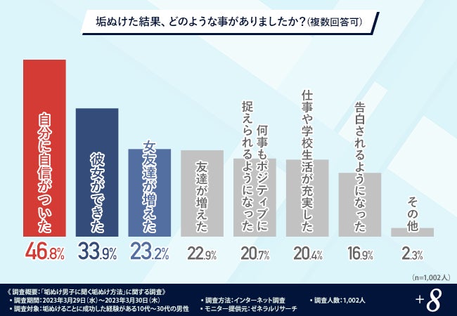 「垢ぬけた結果、どのような事がありましたか?(複数回答可)」と質問したところ、『自分に自信がついた(46.8%)』と回答した方が最も多く、次いで『彼女ができた(33.9%)』『女友達が増えた(23.2%)』と続きました。