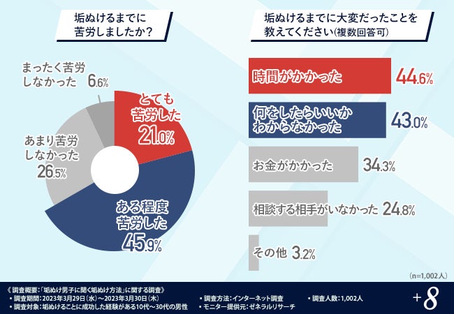 そこで、「垢ぬけるまでに大変だったことを教えてください(複数回答可)」と質問したところ、『時間がかかった(44.6%)』と回答した方が最も多く、次いで『何をしたらいいかわからなかった(43.0%)』『お金がかかった(34.3%)』と続きました。