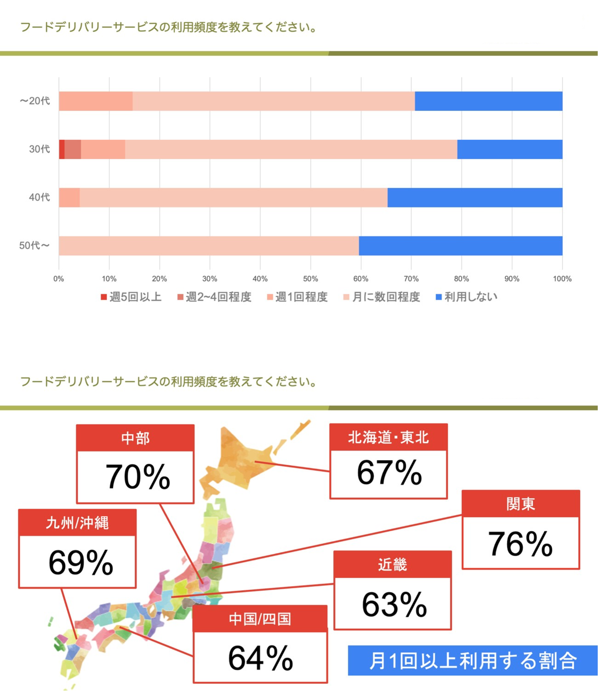 ■世代・地域に関わらず、約 6 割以上が⽉1回は利⽤。30 代が最も使っている様⼦