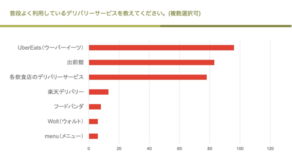 ◇よく使われるサービスは「UberEats」「出前館」「各飲⾷店デリバリー」
