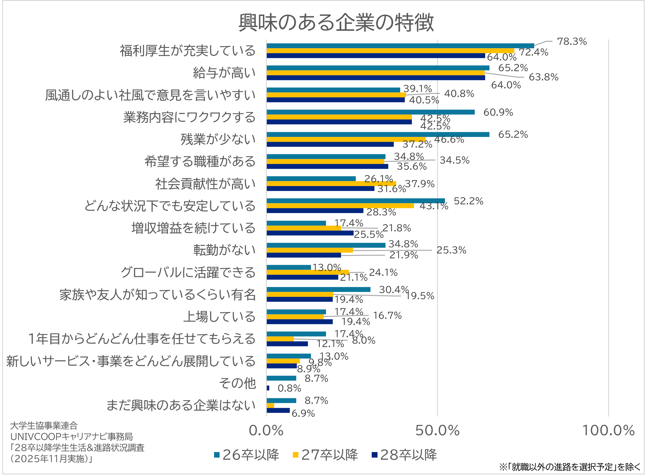 興味のある企業の特徴も回答が分散。「福利厚生」は依然として最重要項目だが、大幅減少(-8.4pt)した。仕事に求めることで「成長できる環境」への回答増加の影響(参照:28卒以降学生生活&進路状況調査(2025年11月実施) 学生生活&キャリア観編)か、「1年目からどんどん仕事を任せてもらえる」も増加しており、企業のサポート力と早期成長環境に注目していると考えられる。本項目は複数回答可としているが、年々1人当たりの選択数が減少しており、特定の条件特定の業界・企業へ学生の興味が集中している可能性がある。【図2】