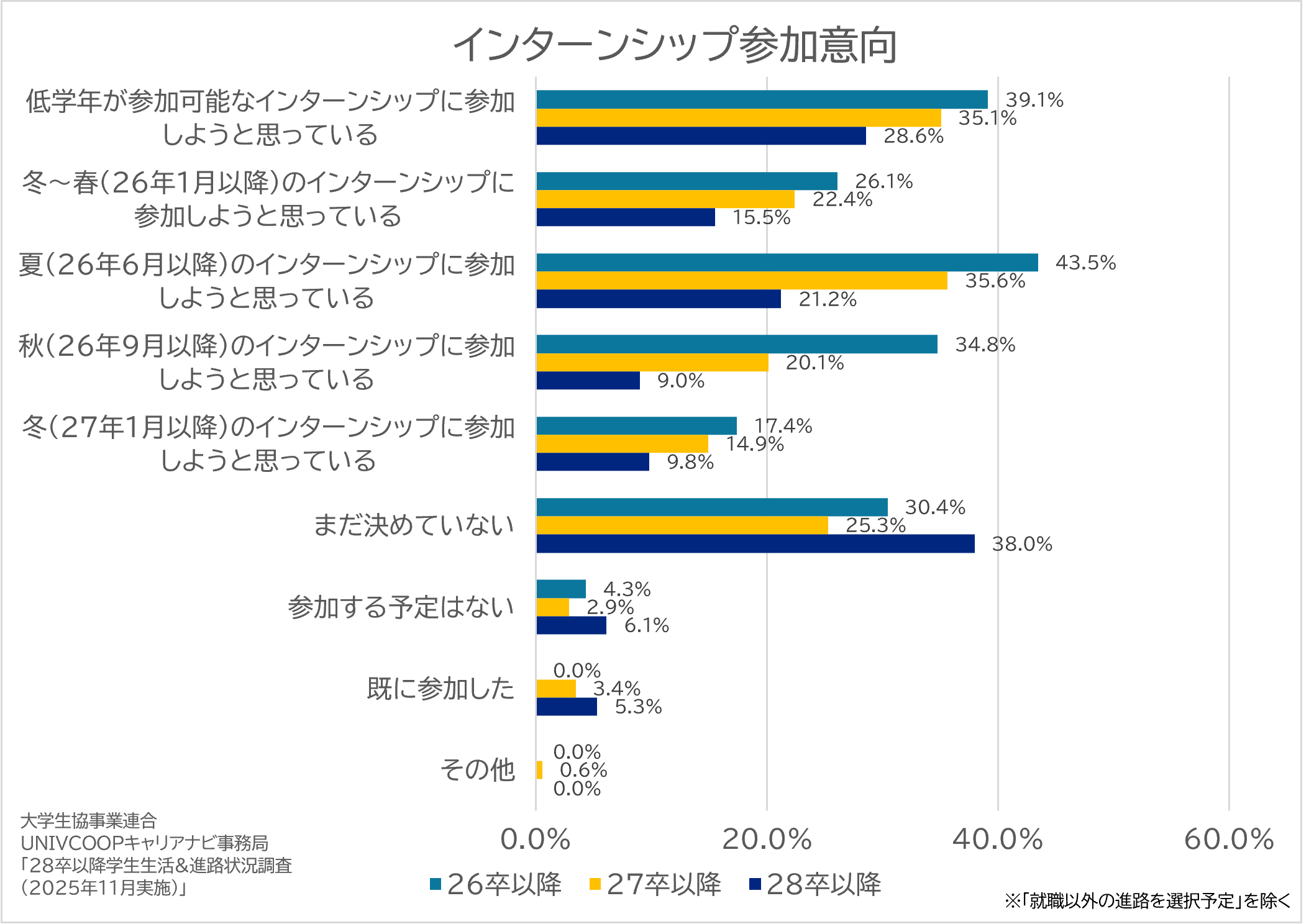 「低学年が参加可能なインターンシップ」への参加意欲・関心が高く、秋・冬よりも優先度が高かった。一方で、夏開催への参加は依然として人気が高い。「まだ決めていない」が最多回答(38.0%)となったが、今回の調査は学部1年生の回答比率が高く、参加意思未決定層の割合が相対的に高く見えている可能性がある。【図3】