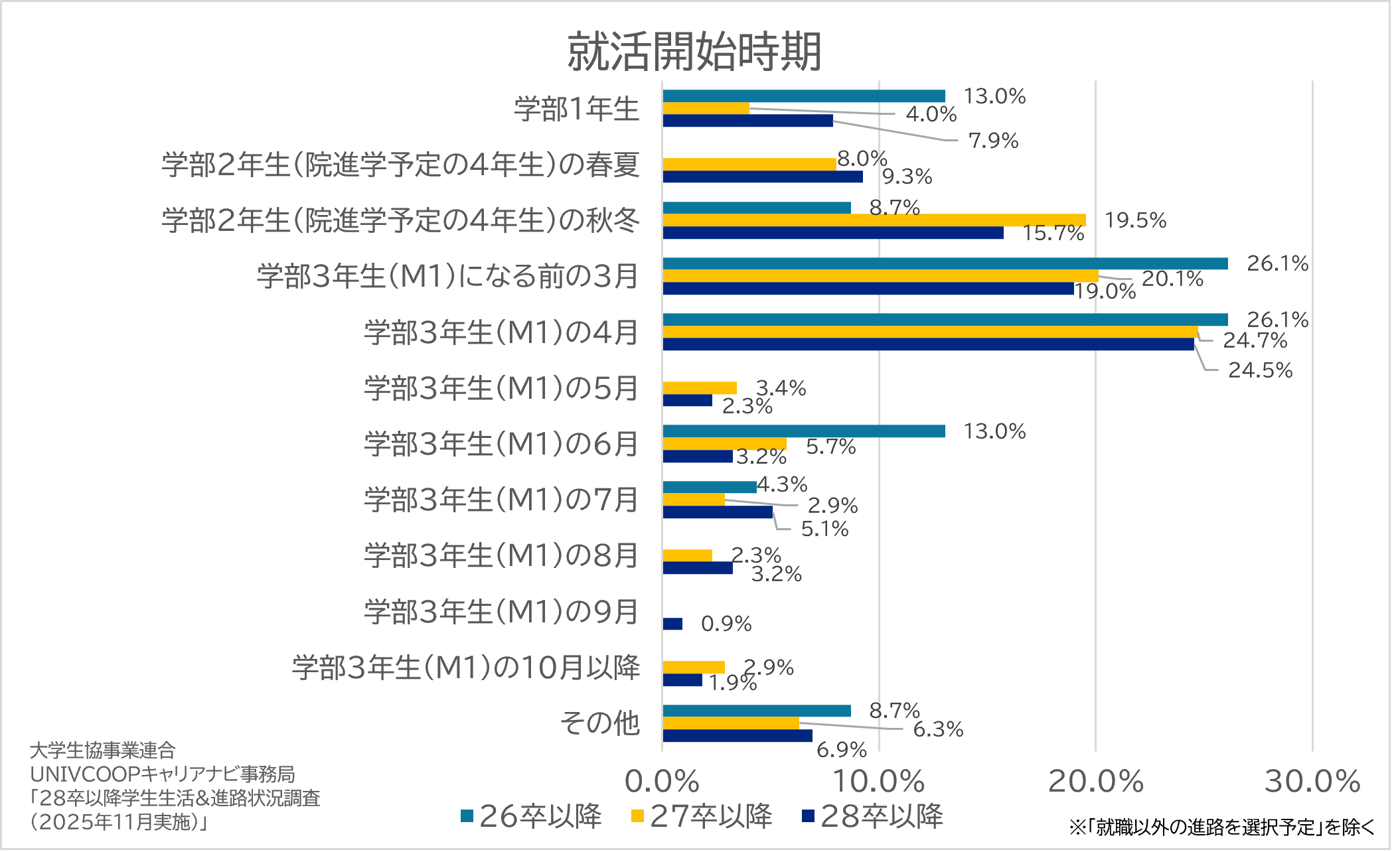 ・<就活開始時期>学部3年生(M1)の4月がピークも早期化&長期化の可能性