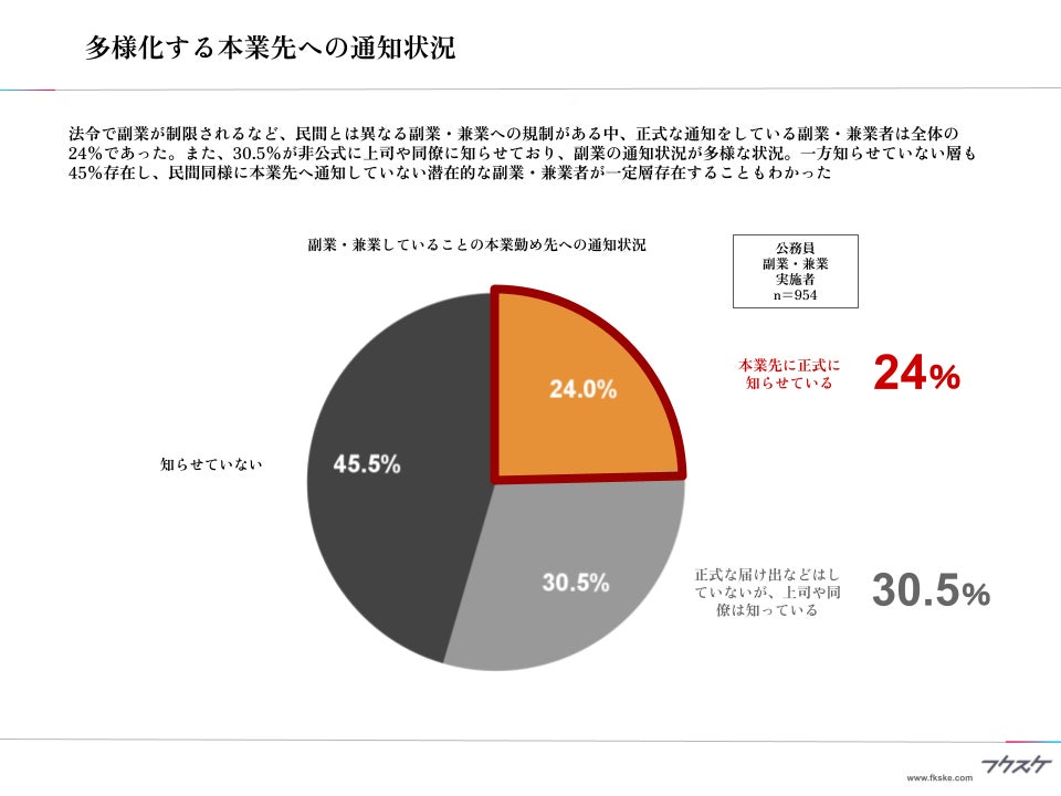 法令で副業が制限されるなど、民間とは異なる副業・兼業への規制がある中、正式な通知をしている副業・兼業者は全体の24%であった。また、30.5%が非公式に上司や同僚に知らせており、副業の通知状況が多様な状況。一方知らせていない層も45%存在し、民間同様に本業先へ通知していない潜在的な副業・兼業者が一定層存在することもわかった。