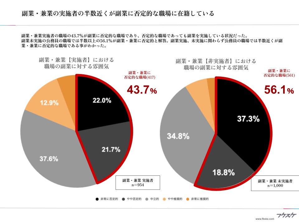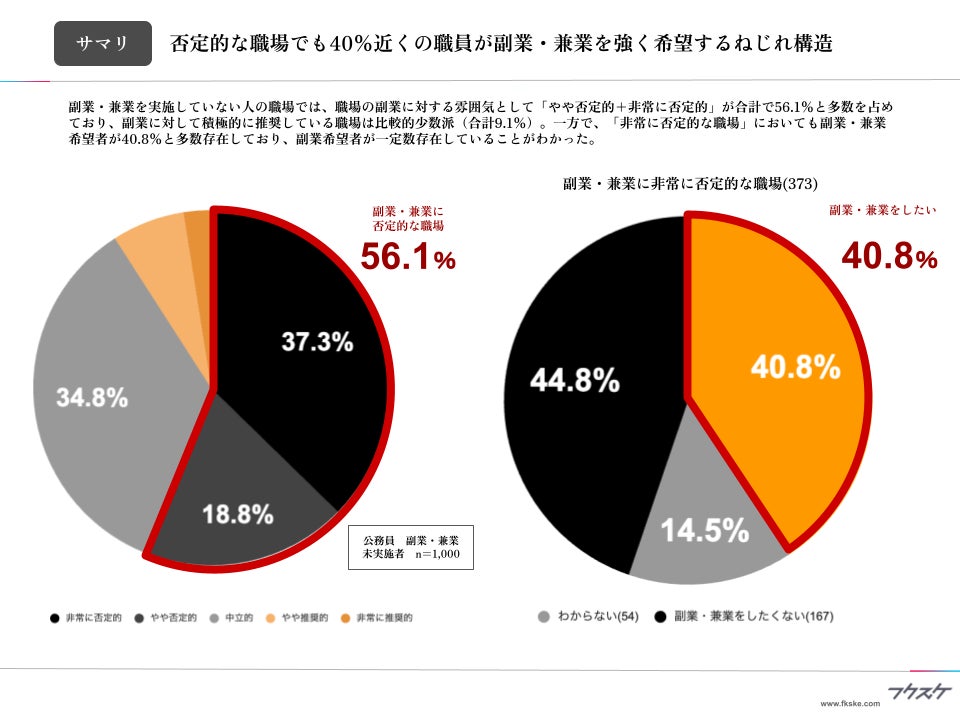 副業事故防止・監査プラットフォーム「フクスケ」を提供する株式会社フクスケ(本社:東京都千代田区、代表取締役:小林 大介、以下「フクスケ」)は、公務員組織における副業・兼業者の実態調査を実施しました。本調査結果では、副業・兼業を実施していない人の職場では、職場の副業に対する雰囲気として「やや否定的+非常に否定的」が合計で56.1%と多数を占める一方で、「非常に否定的な職場」においても副業・兼業希望者が40.8%に登っています。
