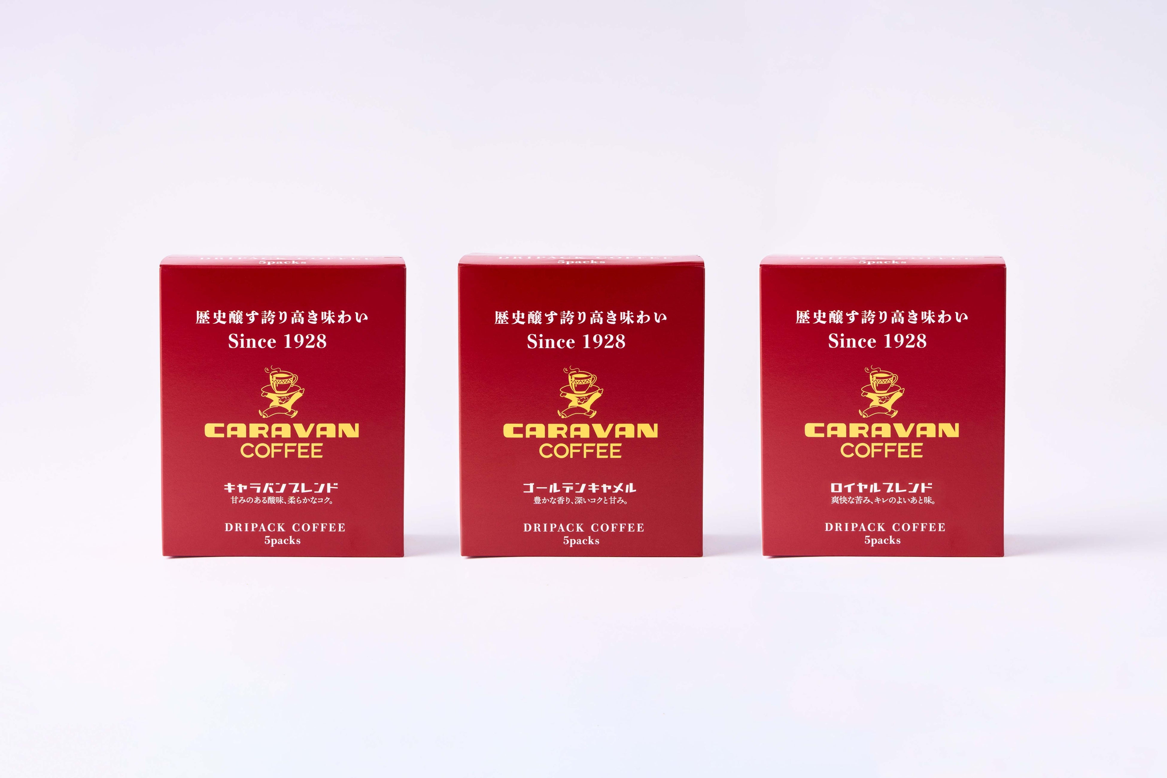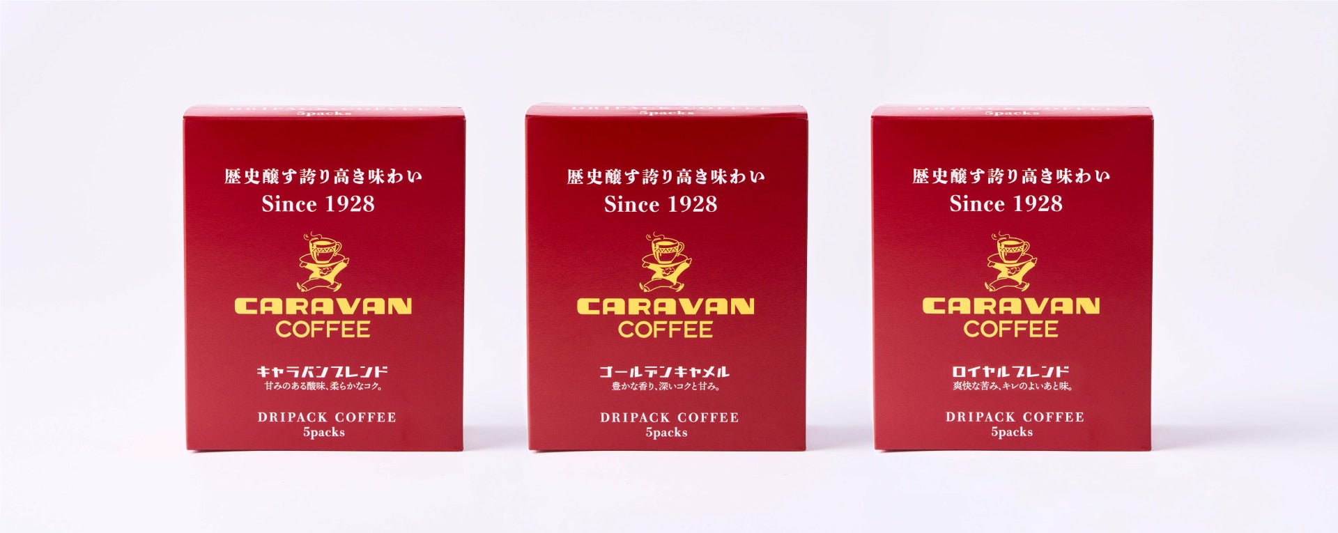 この度、キャラバンコーヒー(運営元:株式会社ユニマットキャラバン/本社:東京都港区/代表取締役社長 菅田貴人)は、4月1日(土)より、キャラバンコーヒーこだわりのブレンドがいつでもお手軽にお楽しみいただける新商品「ドリパックコーヒー キャラバンブレンド/ゴールデンキャメル/ロイヤルブレンド」を発売します。