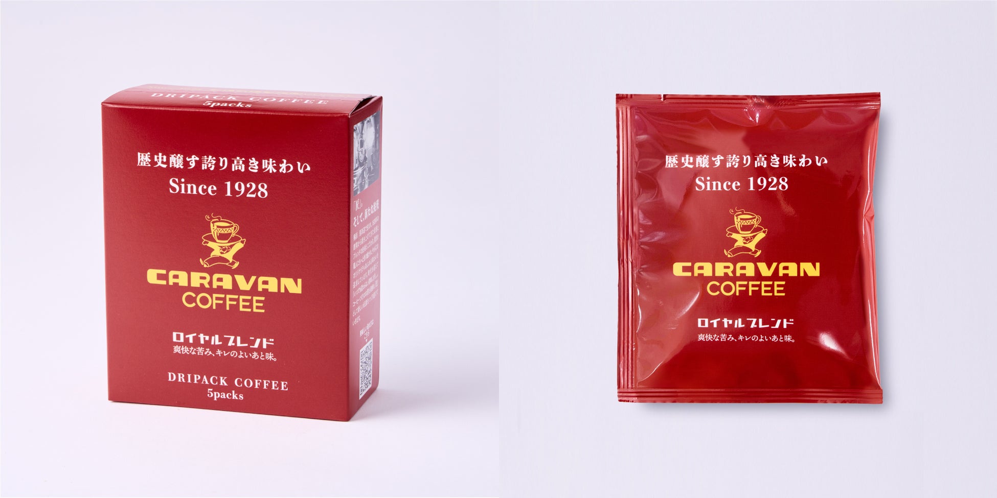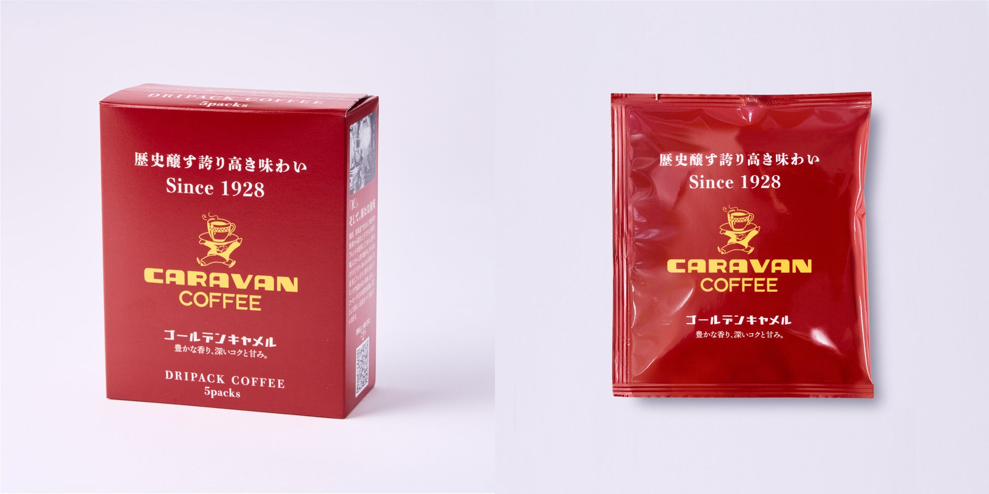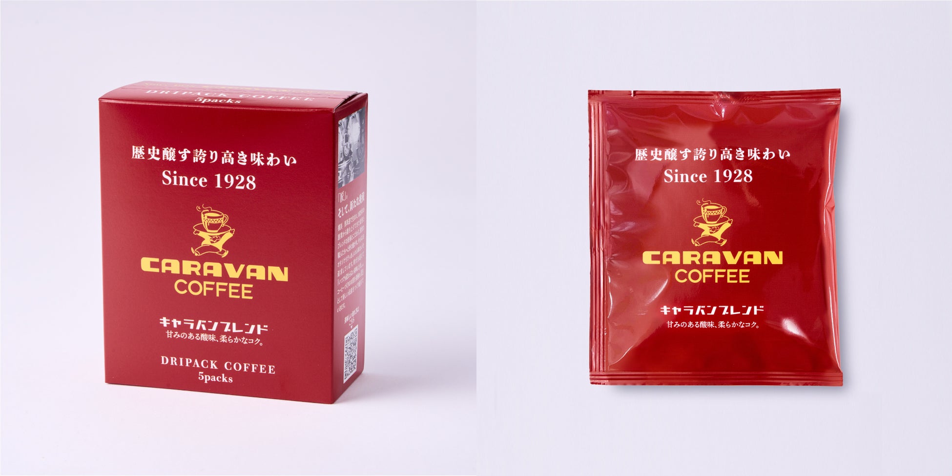 本物のコーヒーの美味しさをお客様にお届けするため、1928年の創業以来、時代の変化にあわせながら、キャラバンコーヒーの真髄ともいえるブレンド技術を追求してきました。そのこだわりを表現するため、キャラバンコーヒーのブランドカラーである「赤」を全面に打ち出した、目を引くパッケージデザインとなっています。「歴史醸す誇り高き味わい」をぜひお楽しみください。