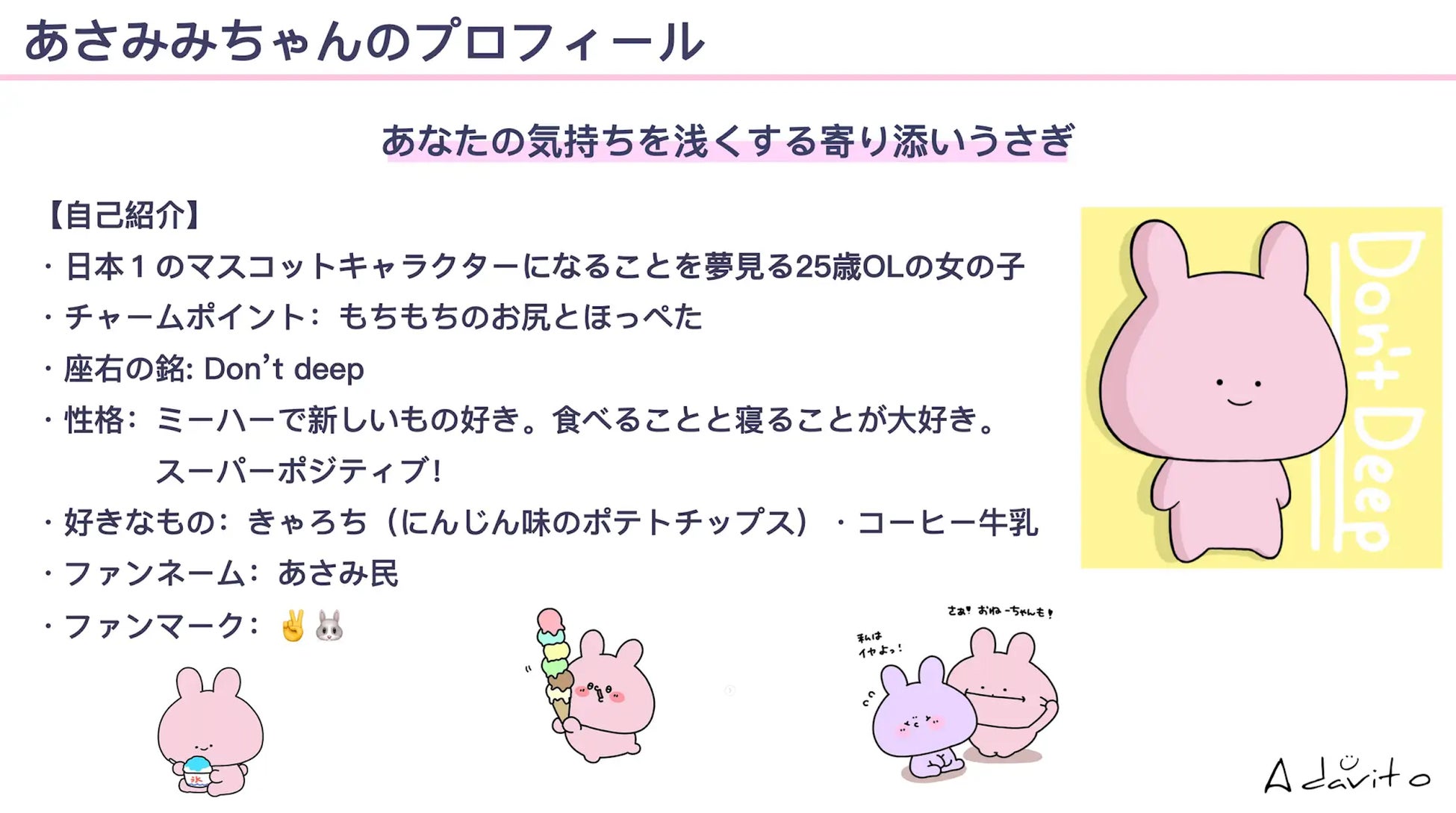 「あなたの気持ちを浅くする寄り添いうさぎ あさみみちゃん」は株式会社アダビトが運営するキャラクタータレント事務所「Simple Side Mascots(通称:サイマス)」に所属するキャラクタータレントとして、2021年6月にTikTokアカウントを開設し、タレント活動を開始。その後アカウント開設から約10ヶ月で、TikTokマスコットキャラ部門フォロワー数日本一を達成するなど、SNSを中心に活動しています。