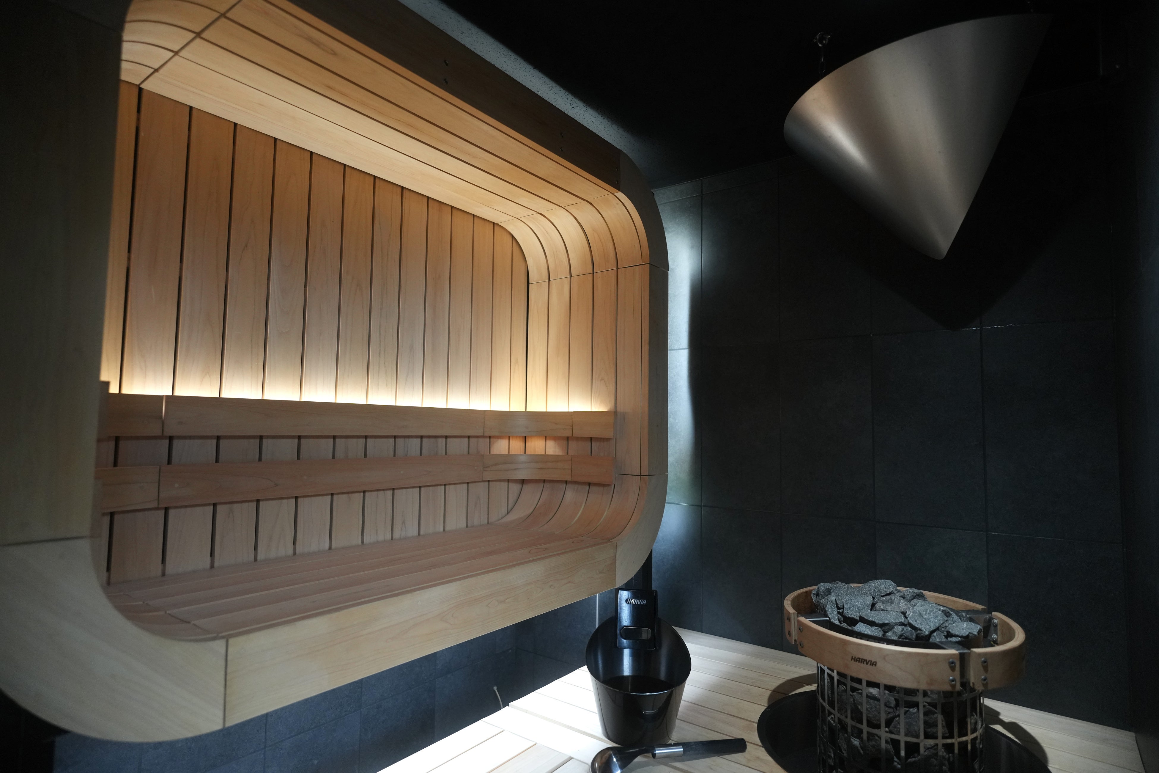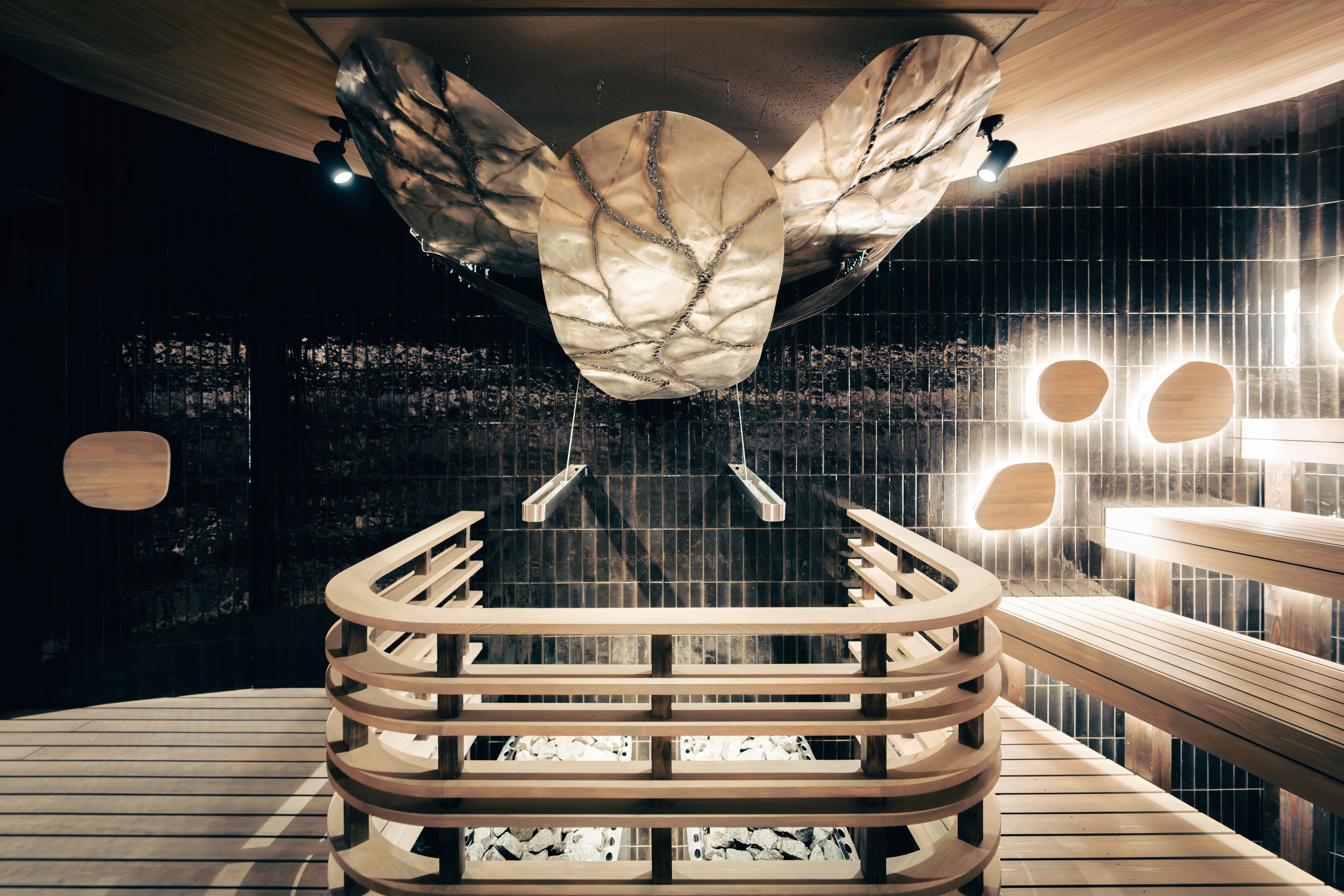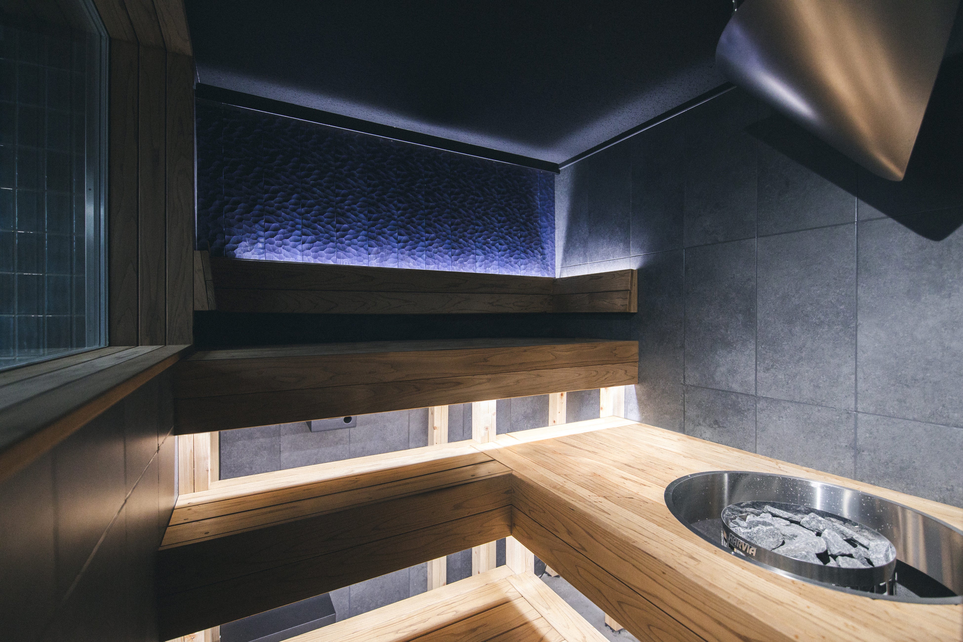 さらに、自社開発のアロマオートロウリュウ装置では、高所からシャワー状にアロマ水を放出し、サウナ室全体へ香りを豊かに広げます。光に照らされて降り落ちる水の煌めきは、視覚的な心地よさも演出します。これらの技術とデザインが融合することで、音・香り・熱が繊細にめぐる“深い没入空間”を実現しました。
