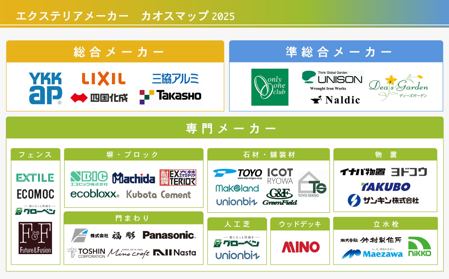 本カオスマップでは、エクステリア製品を提供する主要企業・サービスを独自に調査し、業界の動向をより分かりやすく整理しています。