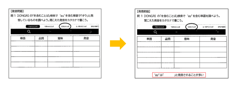 自作のワークシートには、指定された重要語句の日本語訳を書き入れるような内容はない。そうではなく、共通のフォニックスや接尾辞をもつ言葉を調べたり、語のイメージと対応付けて用例・和訳を書いたり、成句の調べ方を学んだりする内容が並んでいる。生徒が比較を通じて単語のつくりや意味の広がりの共通性に気づき、辞書の見方を学ぶことができる問いの工夫を感じた。また、設問をよく見ると、初めは共通するフォニックスの発音を明示する一方、課題の回を重ねるごとに生徒が自分で共通性を発見できるよう段階的に内容(下右図の赤枠内)が設定されていた。