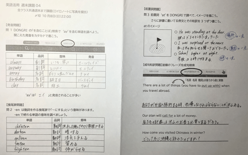 木村教諭は、辞書の活用法を学ぶ自作のワークシートを定期的に週末課題に出している。DONGRIを導入してからは、生徒が共通した辞書を使用することになり、辞書指導が行いやすくなったという。