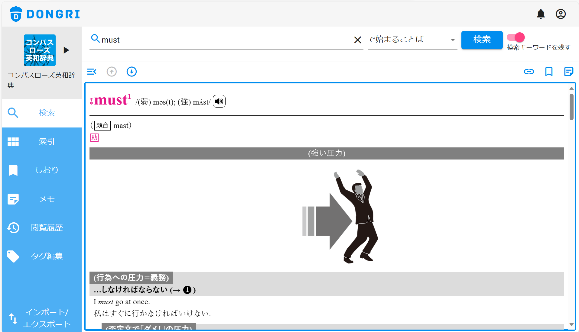 図左:『コンパスローズ英和辞典』の語釈をDONGRIで表示