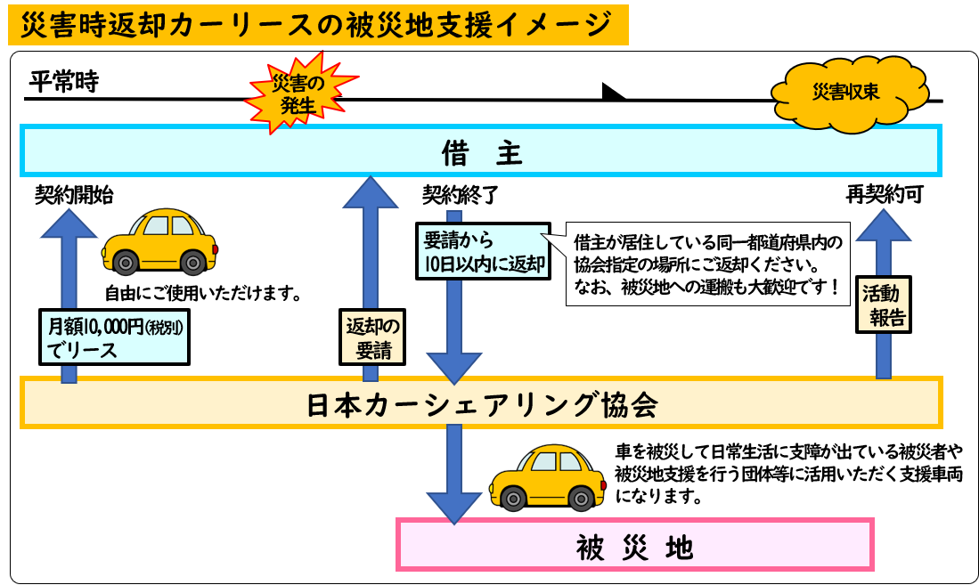 タイトル:「被災時に車を無償で借りられる」明日の災害に備える仕組みにご支援を