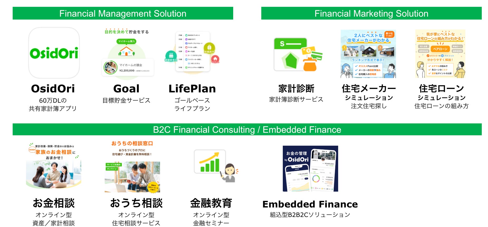 家族の未来を構築するゴールベースアプローチの「ライフプラン」や目的貯金サービス「Goal」、住宅購入支援サービス「理想の住まい探し」、お客様のお金の総合相談窓口「家族のお金相談」、金融機関様向けEmbedded Financeサービスの「OsidOri for Bank」などの提供および運用支援実績があります。