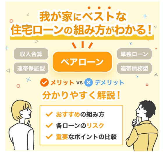 住宅購入者が、ペアローンや夫婦合算、単独ローン等、様々なローンの組み方がある中で、どのようなローンを組むべきかをシミュレーションするサービスです。