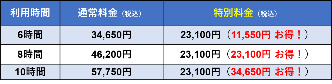 【特別料金】¥23,100〜/日(最低利用時間:2時間~)