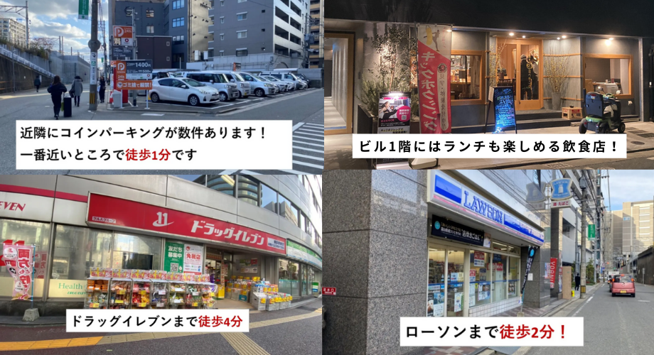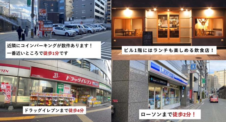 徒歩1分圏内にコインパーキング、コンビニまで徒歩2分、ドラッグストアまで徒歩4分と