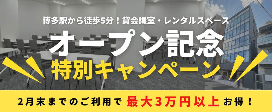 税理士法人を核に全国8拠点で中小企業・資産家向けに各種サービスを展開するアイユーコンサルティンググループ(東京都豊島区、代表取締役社長:岩永 悠/代表取締役副社長:出川 裕基 以下当グループ)は、福岡市博多区の自社ビル3Fにオープンした貸会議室・レンタルスペースで特別割引キャンペーンを開始致しました。