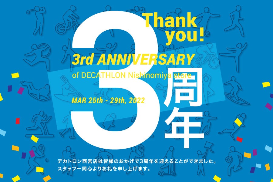 デカトロンジャパン株式会社(本社:兵庫県西宮市)は、このたびオープン3周年を記念し、3月25日(金)~29日(火)までの5日間、周年祭を開催します。