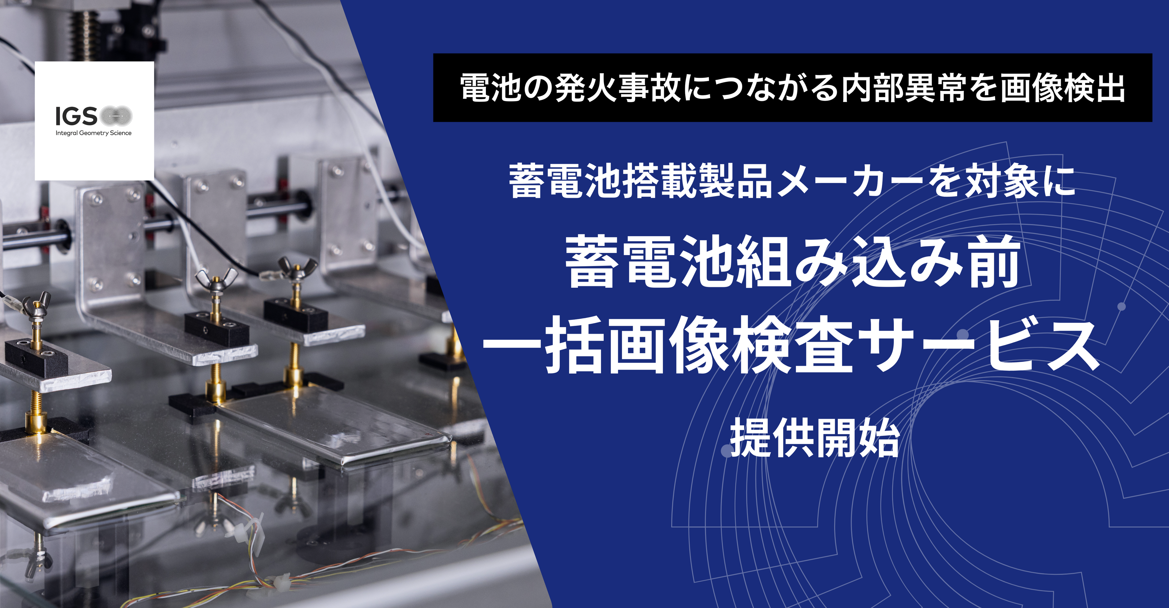 株式会社Integral Geometry Science(以下「IGS」)は、電機・家電メーカーなど蓄電池を搭載する製品メーカーを対象に、蓄電池の発火や寿命低下の要因となる電流異常を組み込み前に検査する「蓄電池組み込み前 一括画像検査サービス」を2026年3月17日(火)に提供開始します。また2026年3月17日(火)~19日(木)に東京ビッグサイトにて開催される「第20回 BATTERY JAPAN 二次電池展」に本サービスで使用する検査装置『蓄電池非破壊画像診断システム』を展示します。